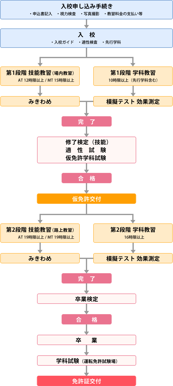 それぞれ第1段階を終了後、修了検定及び適性試験、学科試験を受けます。(満18歳以上)